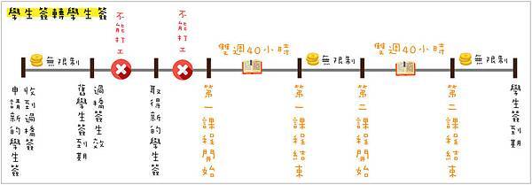 若目前為打工度假簽,在申請學生簽後,會先收到過橋簽證A (Bridging Visa A)。因當時仍持有打工簽,所以打工時數無限制。而在打工簽證過期後,先前收到的過橋簽A就會生效,而過橋簽通常是延續前一個簽證的條件,所以持有過橋A期間,打工仍是無限制!(然而學生簽生效後,就不得從事任何工作,直到第一個課程開始後,才能雙週打工40小時喔!)
