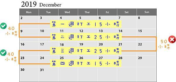 第一、二週打工共計40小時。第三、四週打工共計40小時。這個狀況下是合乎學生簽的打工條件的。