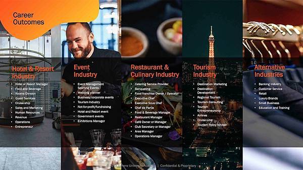 - 飯店管理對接全球性飯店集團,如:洲際、香格里拉、希爾頓、凱悅國際、四季酒店