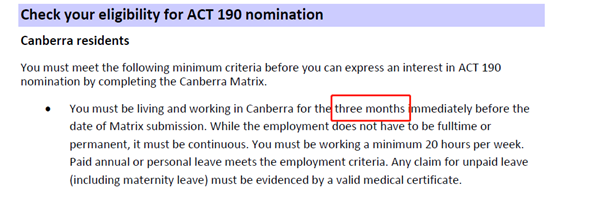 新政顯示,7月1日後遞交Matrix的境內申請人,只需在堪培拉居住及工作滿3個月就可以了。而根據之前的條件,ACT州政府打算在19年7月將ACT居住2年作為提交州擔保(Canberra Resident)的基本要求。