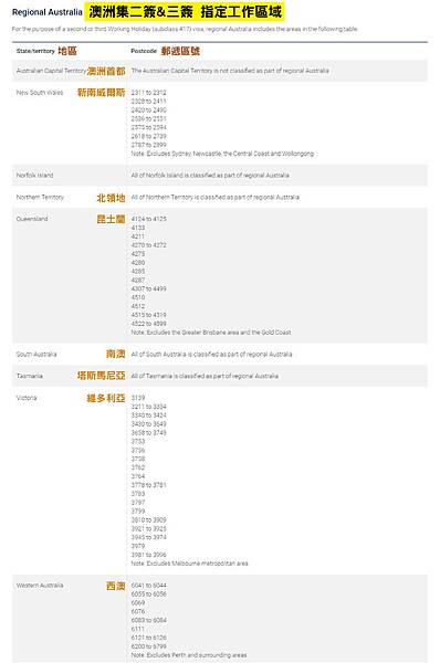 澳洲集二簽三簽的工作區域(圖截自澳洲移民局網站https://pse.is/LUARK 截圖如看不清楚請直接點官方連結查詢)